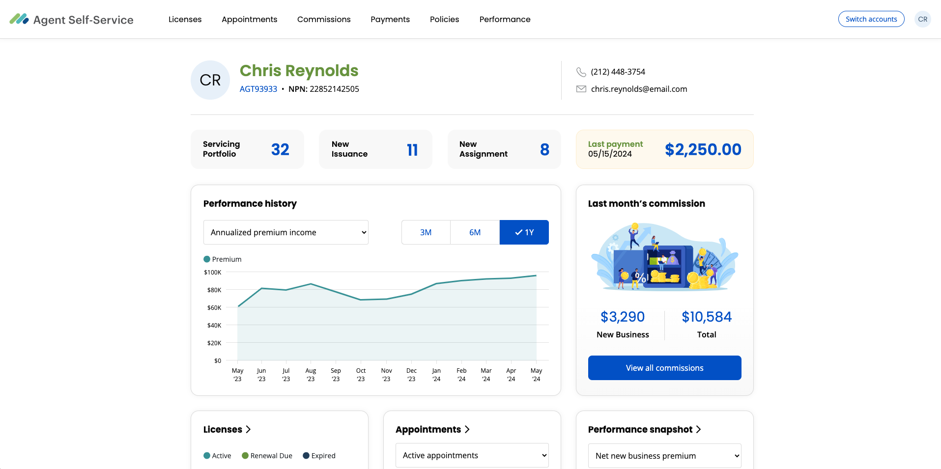The Agent Self-Service Portal provides agents and agencies with a centralized platform to track performance analytics, manage licenses, view commissions, policies, payments, and appointments—all in one convenient dashboard.